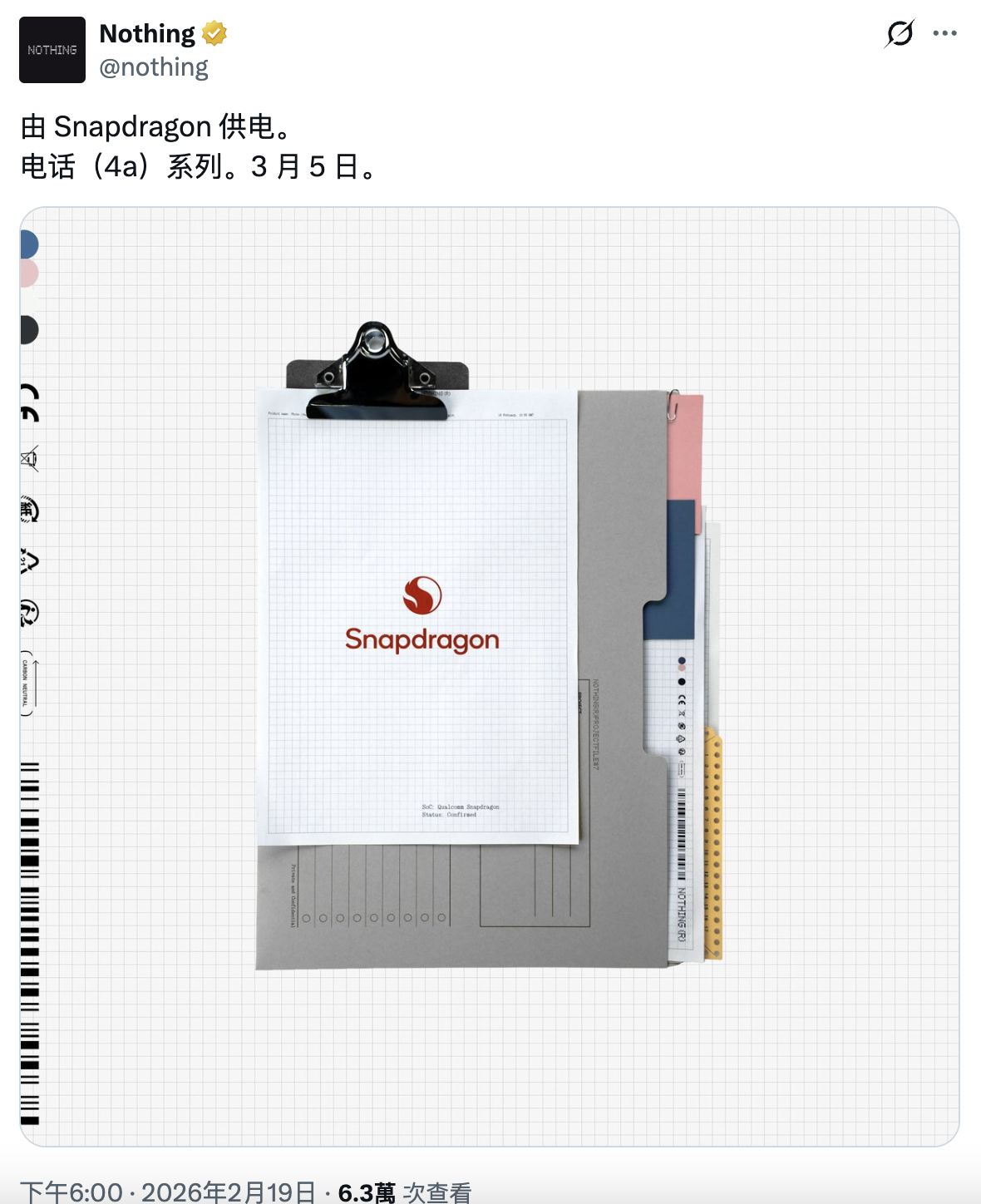 从预热图片中我们可以看到一个夹着高通骁龙 Logo 的文件夹,明示新机将搭载骁龙处理器。并且官方还在配文中表示,Phone (4a) 系列机型将在 3 月 5 日发布。
